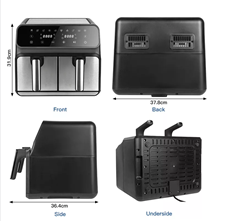 with two basket to cook 2 kinds of food 2 independent 4L zone have their own cyclonic fans and rapid heaters.SS304 heating element Temperature adjustable 60~200C Timer up to 60 mins LCD display with Touch screen 10 cooking preset Capacity: Double tray fryer pot 4L +4L Non-stick coat with LFGB FDA safety 4 in 1 Versatility : air fryer, Roast, Reheat,Dehydrate Over heating protectiong Non slip feet Cool touch housing and handle 60 mins timer with auto-shut off |